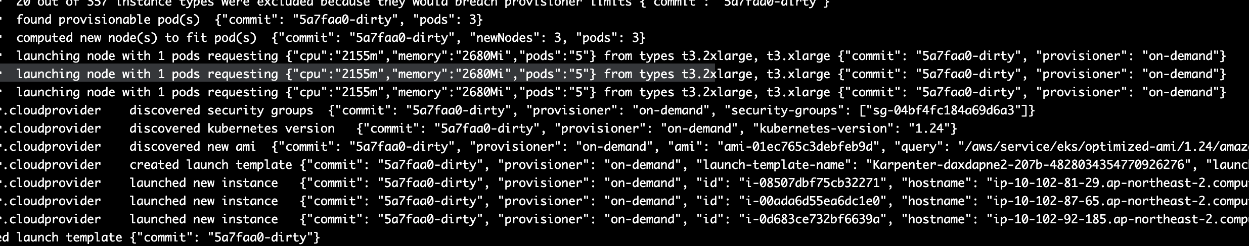 Karpenter Pod의 동작 Log 카펜터 파드의 로그를 보면 Pending상태인 파드가 3개 가 있고 이를 위해 3개의 온디맨드 타입의 노드가 새롭게 뜨는 것을 확인해 볼 수 있습니다. 이 동작이 어떻게 이뤄질까요? 프로비저닝도 Provisioner의 특정 조건에 만족해야 하는데, 이 조건들이 무엇인지에 대해 하나씩 짚어보도록 하겠습니다.