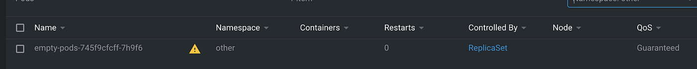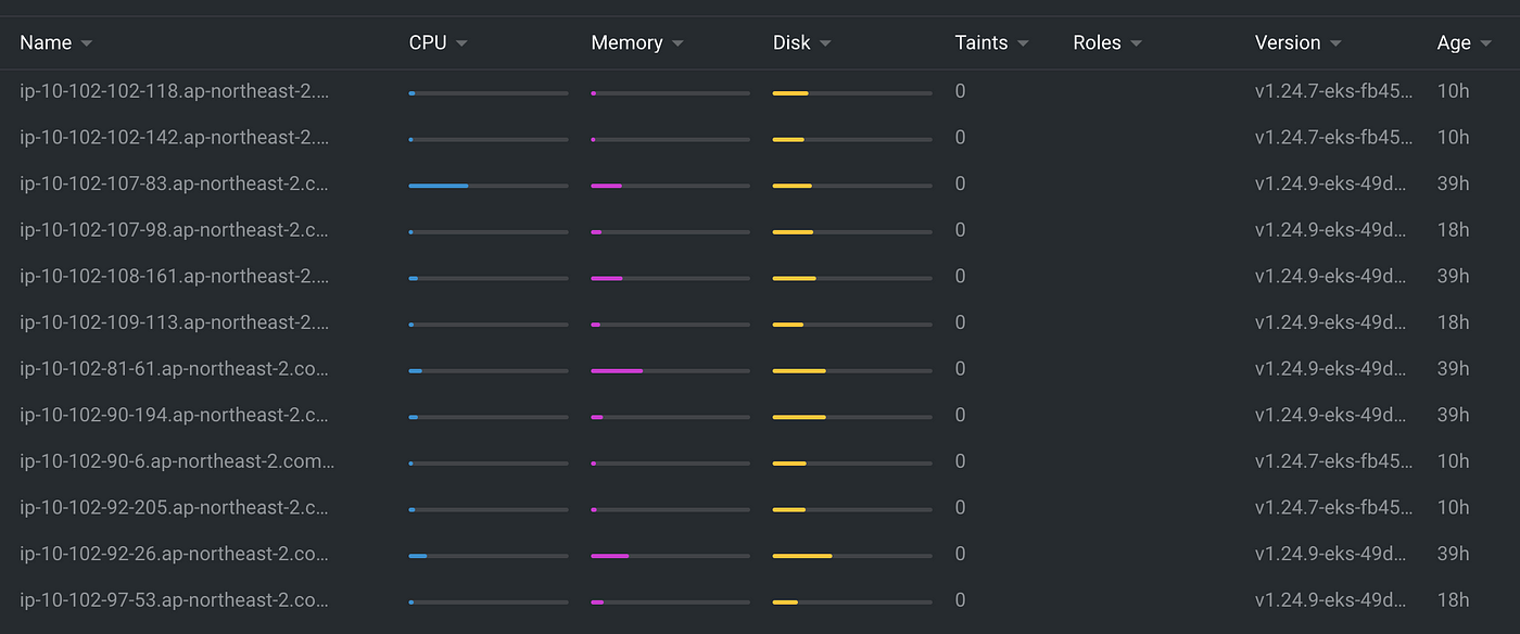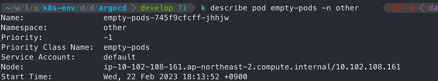 그림 6를 보면 12대의 워커 노드가 있는 클러스터가 있습니다. 이 워커 노드들에는 aws-node나 kube-proxy, argoCD와 같은 여러 파드들이 떠 있습니다. 여기에 그림 7과 같이 other라는 네임스페이스를 생성하고 Priority가 -1인 PriorityClass를 빈 파드에 적용했습니다. 빈 파드는 10.102.108.161이라는 주소를 가진 노드에 할당된 것을 확인할 수 있습니다.