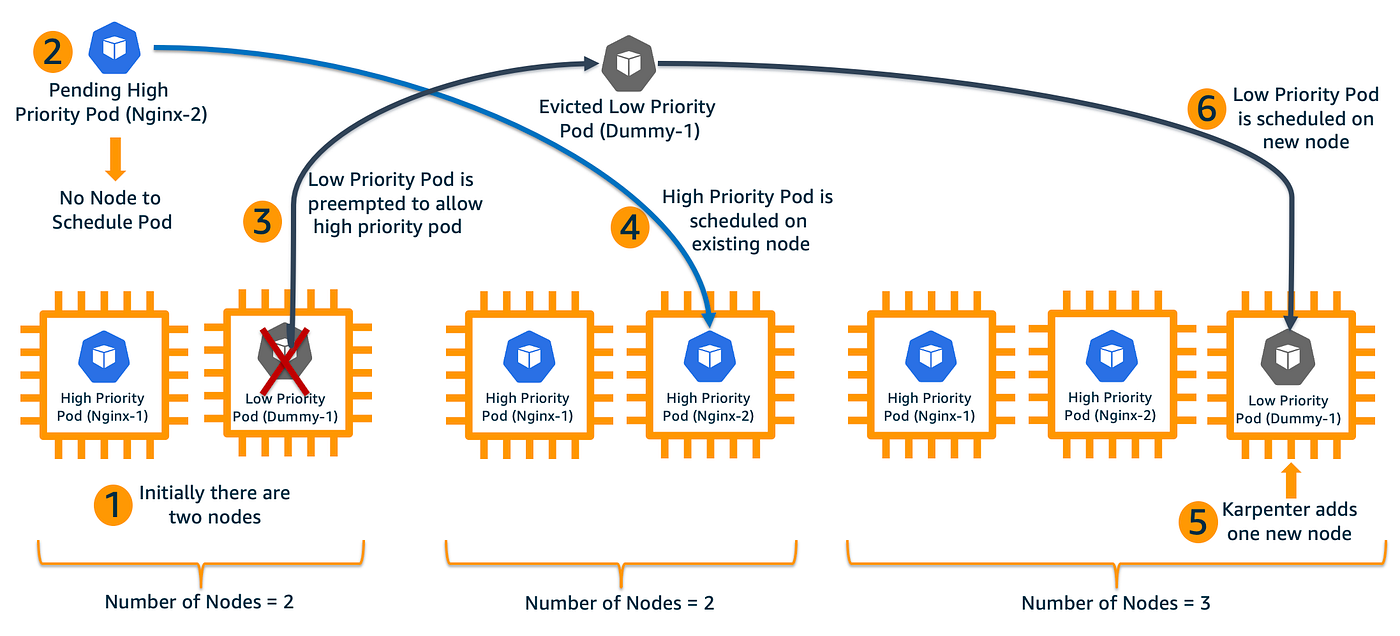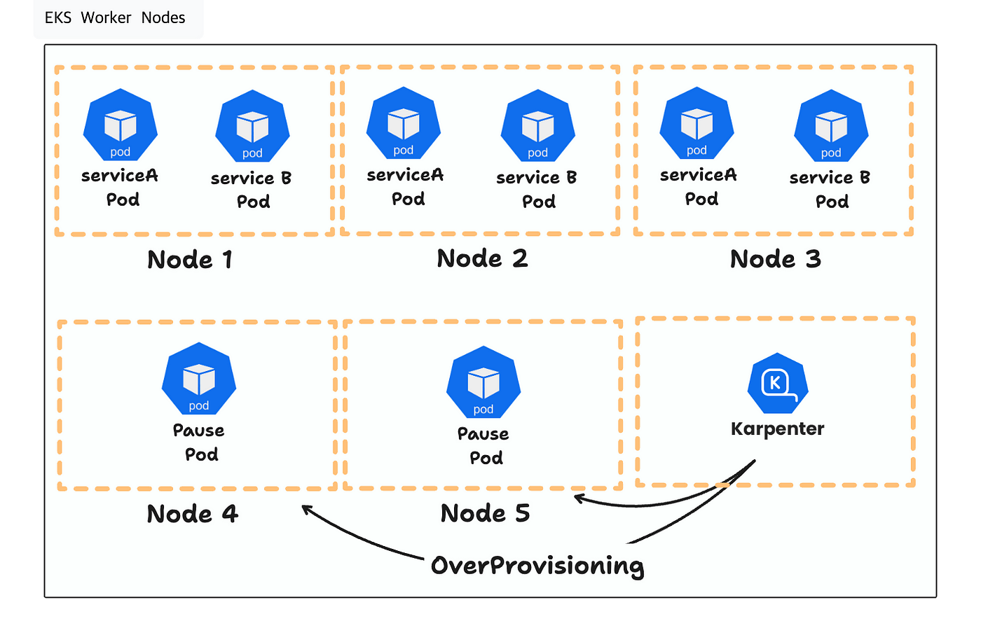 이제 위에서 설명한 PriorityClass와 빈 파드, 그리고 카펜터를 활용해서 어떻게 오버프로비저닝을 적용하는지 그림 5를 통해 순서대로 알아보도록 하겠습니다.