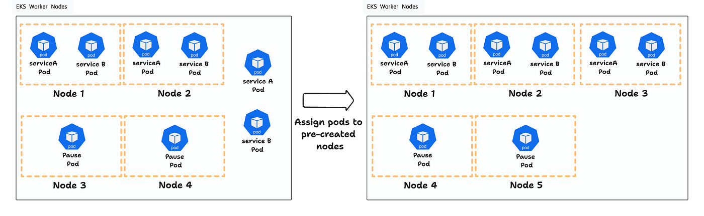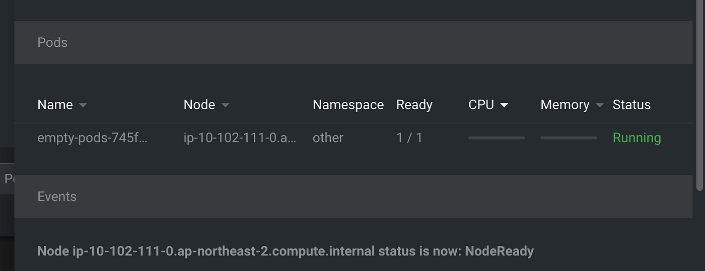 - 카펜터는 낮은 우선순위를 가진 파드(빈 파드)를 할당하기 위해 새로운 노드를 증설합니다.