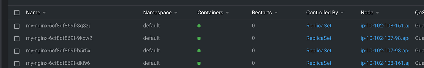 그림 7. PriorityClass가 적용된 빈 파드 그 다음 서비스 파드를 가정하기 위해 별도의 PriorityClass가 적용되지 않은 nginx 파드를 같은 클러스터에 배포해 줍니다. 그림 8에서 볼 수 있듯이 nginx 파드들이 할당될 자원이 충분하기 때문에 빈 파드가 바로 축출되지 않고, nginx도 정상적으로 배포되는 것을 확인할 수 있습니다.