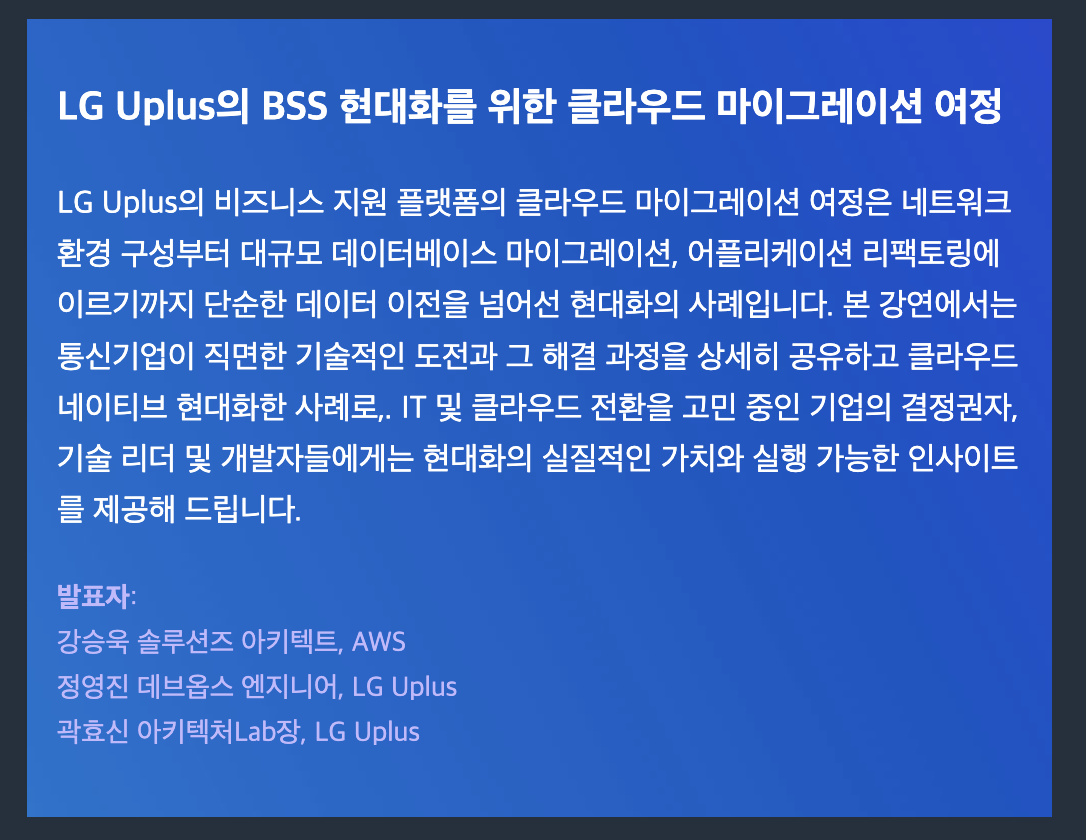 이번년도에도 AWS Summit Seoul 2024의 Day 1 중 통신, 미디어 및 엔터테인먼트 Track에서 LG Uplus의 BSS 현대화를 위한 클라우드 마이그레이션 여정라는 주제로 발표를 진행했습니다.