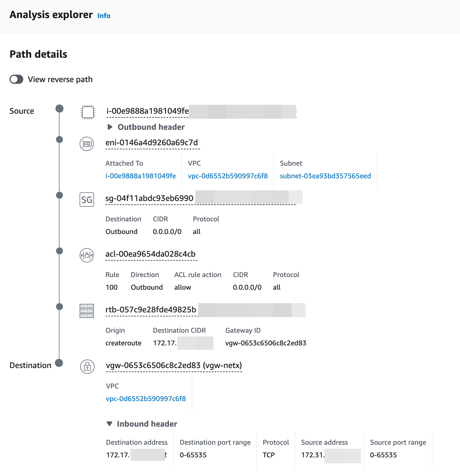 VPC Reachability Analyzer에서 Source와 Destination을 지정해주게 되면 경로상 막히는 부분이 없는지를 확인할 수 있습니다. 그래서 Nginx Proxy Server로부터 DXGW를 타기 전까지인 VGW까지 정상적으로 트래픽이 도달하는지를 확인해 본 결과 아래와 같이 정상적으로 도달하는 것을 확인할 수 있었습니다.