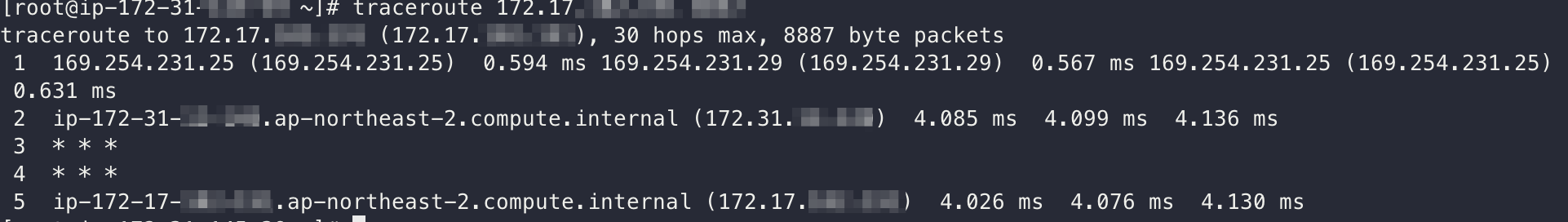 위 그림과 같이 172.31 Private Subnet에 있는 Nginx Proxy Server로부터 타겟이 되는 172.17 대역으로 traceroute를 해본 결과 정상적으로 나가지 못하는 것을 확인할 수 있었습니다.