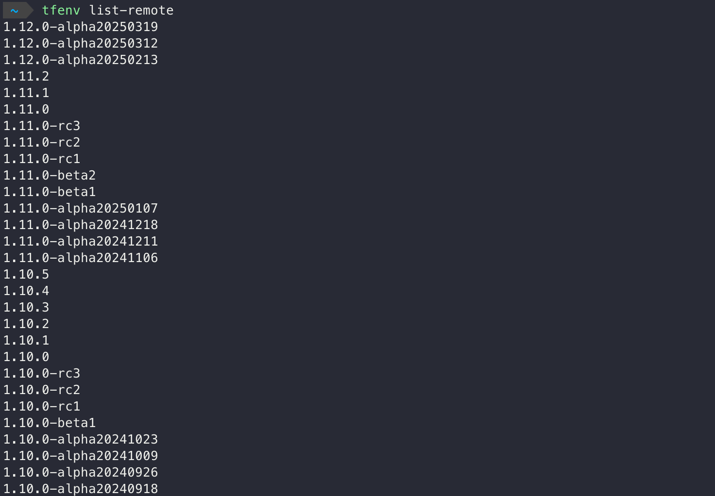 먼저 로컬에 설치할 terraform cli 버전을 확인하기 위해서는 tfenv list-remote를 실행하면 아래 사진과 같이 설치 가능한 목록이 나오게 됩니다.