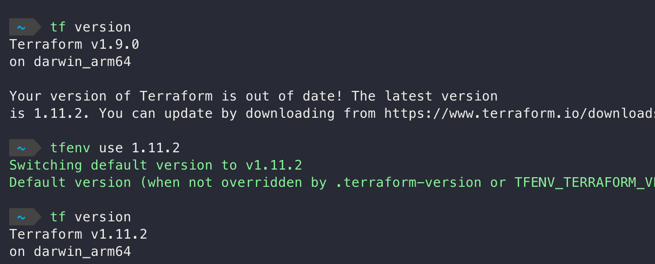 그렇게 않으면, 새로운 버전을 설치하고 전환을 해도 환경변수가 우선적으로 적용되기 때문에 버전이 전환된 게 제대로 적용되지 않습니다.그리고 latest로 설치를 하게 되면 terraform 1.11.2가 설치됩니다.