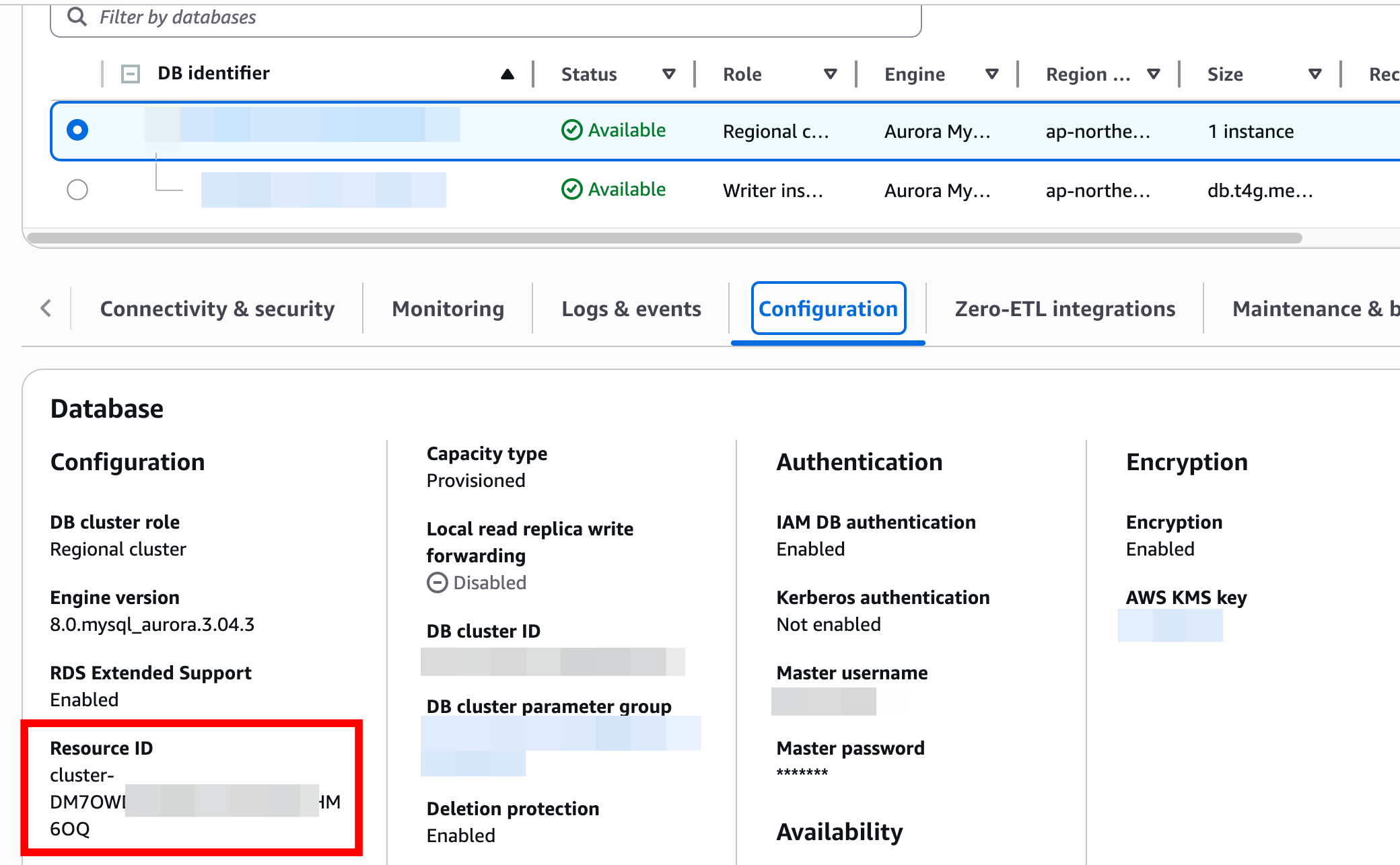먼저 클러스터에 설정된 Resource ID를 확인해야 합니다. 해당 Resource ID와 username을 조합으로 IAM policy에 권한을 부여하게 됩니다.