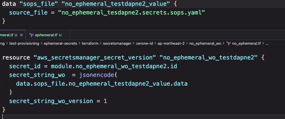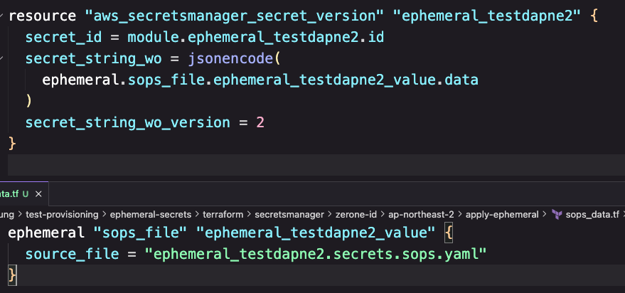 Fig 3-3. 참조해서 만든 AWS Secrets Manager 이번에는 Ephemeral Resource와 Write-Only Arguments를 모두 적용해서 AWS Secrets Manager Resource를 생성해보도록 하겠습니다. Fig 4-1. 과 같이 참조할 값이 암호화 되있는 sops_file은 Ephemeral Resource로 임시로 참조해서 State에 남지 않도록 구성하고, secrets_string_wo 속성과 sercets_string_wo_version 속성을 활용해서 Write-Only Arguments를 지정해서 Resource를 생성하도록 합니다.