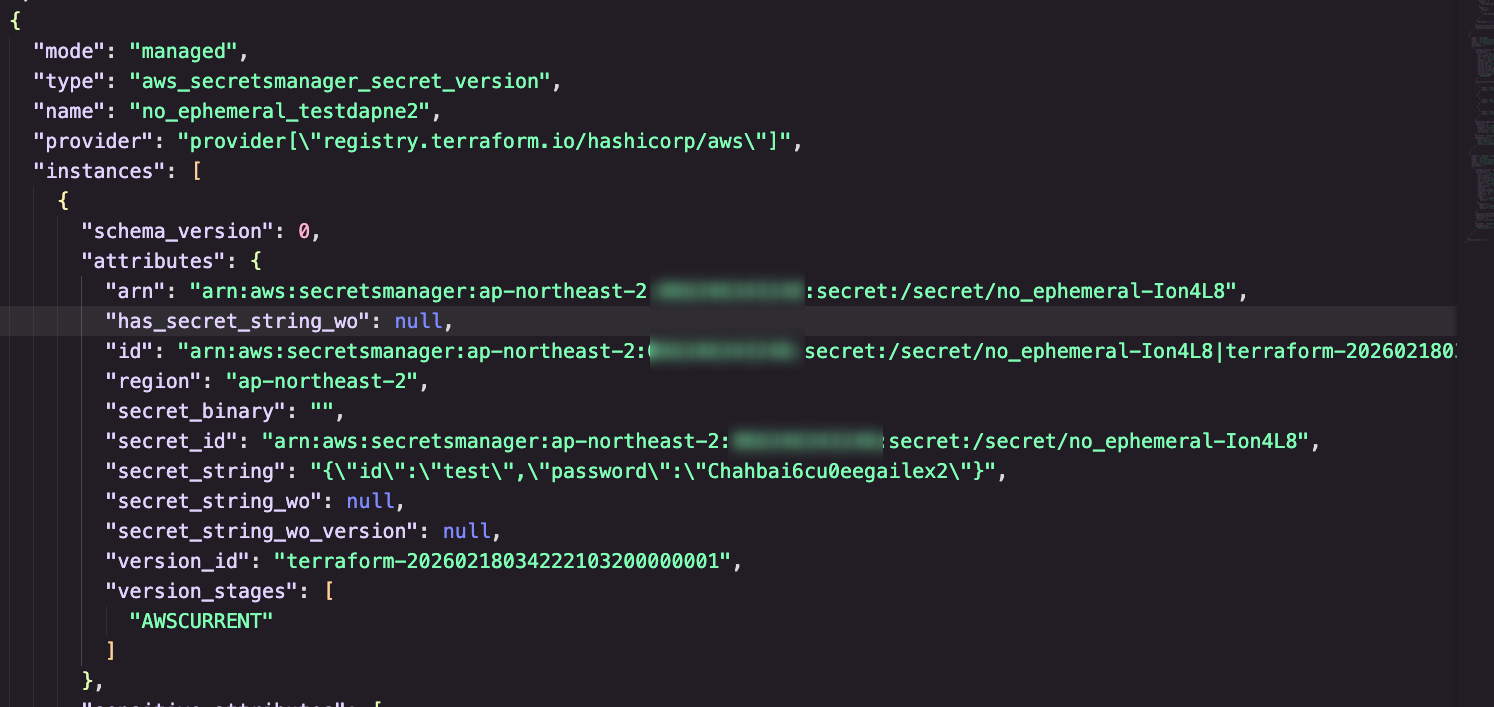 하지만 Ephemeral Resources 만으로는 tfstate에 secrets값이 남는 걸 막을 수 없었습니다.