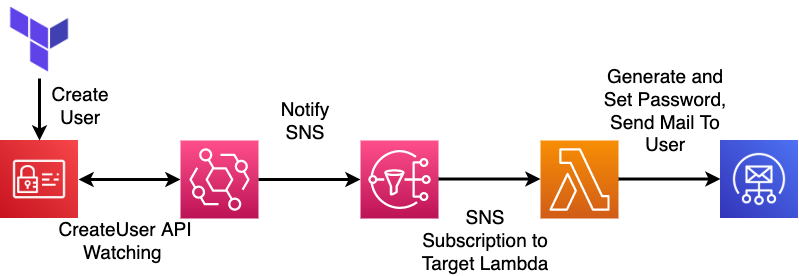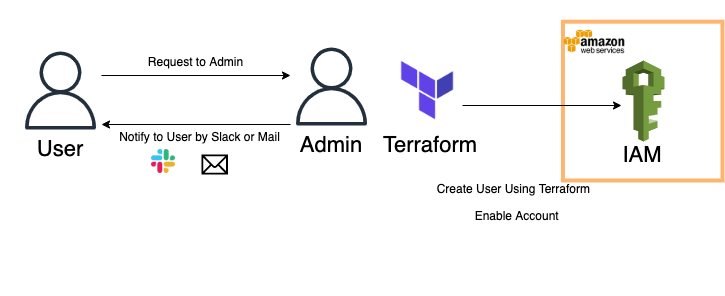 제가 속해있는 조직에서는 AWS와 Terraform을 이용해서 사용자들에게 E-mail의 형태로 AWS계정을 만들어주고, 이를 사용자에게 메일이나 Slack을 이용해 알려주는 프로세스를 갖추고 있습니다.